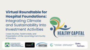 On Thursday, April 10th, 2025 the Health Capital project team presented a review of key findings from the 2025 Canadian Hospital Foundation Survey on Sustainable Investing. This survey was conducted by the Canadian Coalition for Green Health Care in partnership with the Trottier Family Foundation, PEACH Health Ontario, the Canada Climate Law Initiative, and Quinn+Partners. This session also explored: